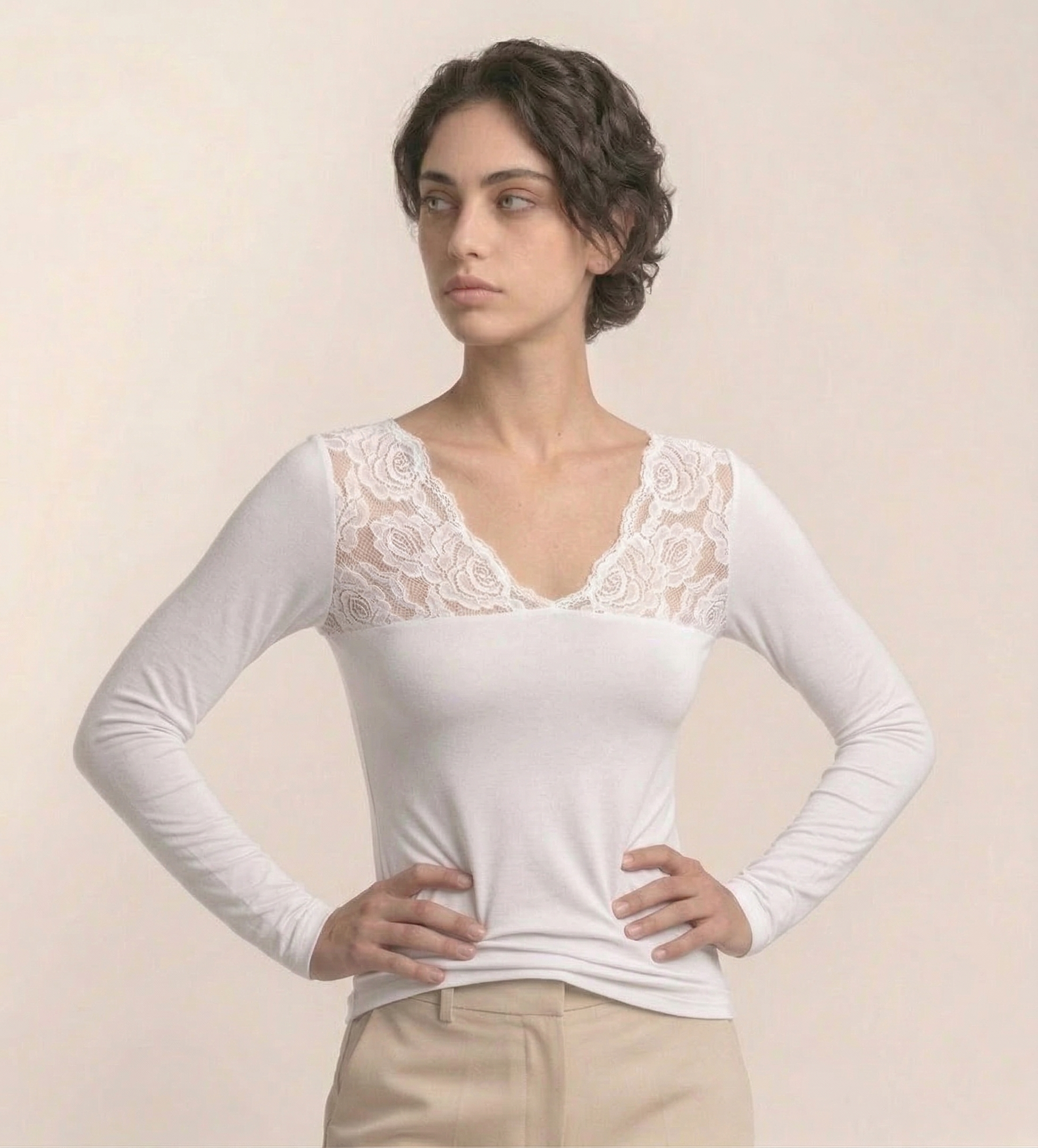 1050 maglia manica lunga con inserto in pizzo a V Bianca